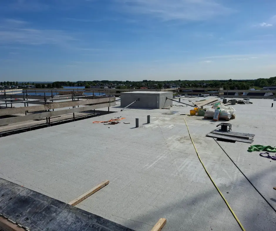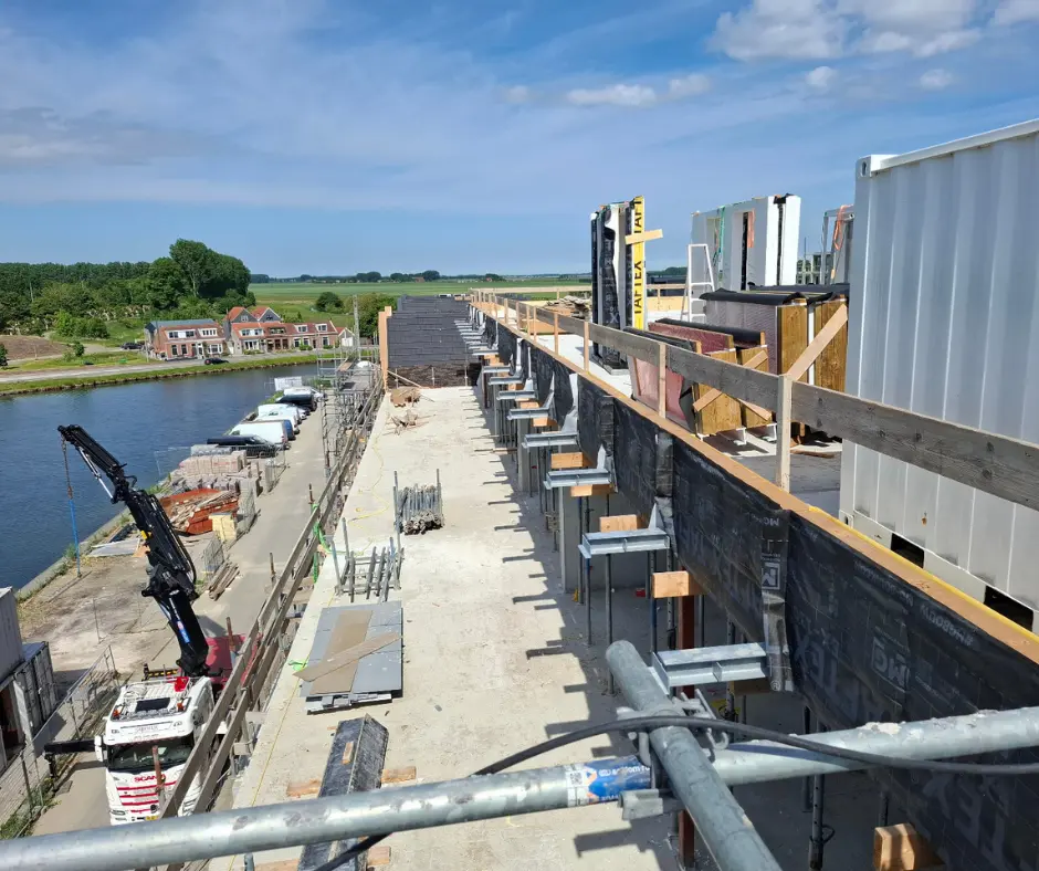 Een belangrijke mijlpaal is bereikt: de laatste verdiepingsvloer is gestort. Daarmee is de betonbouw afgerond. Op dit moment wordt het gevelmetselwerk verder uitgevoerd en worden de tijdelijke stempels verwijderd. Daarnaast is het plaatsen van de prefab houtskeletbouw-wanden (HSB) gestart en wordt de steiger opgebouwd, zodat straks het hele gebouw rondom kan worden voorzien van metselwerk. Binnenkort wordt er gestart met het plaatsen van de binnenwanden.